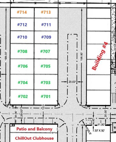 Unit 714 - SOLD - 21.5 x 50, (1075 sq. ft.), Total square feet = 1,612. Optional side wall and back wall windows eligible. 1 of only 3 units this size in entire complex. Eligible for side wall windows, optional owner upgrade.